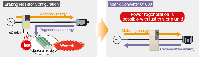 Biến tần Yaskawa U1000 là biến tần hiệu suất cao dựa trên công nghệ chuyển đổi Matrix mới nhất. Với khả năng tái tạo năng lượng đầy đủ nó nó giúp tiết kiệm năng lượng tuyệt vời và làm giảm tải trên các thành phần lưới như máy biến thế và đường dây điện. Với một hình dạng,kích thước cực kỳ nhỏ gọn, U1000 là sự lựa chọn đầu tiên cho các giải pháp sáng tạo, tiết kiệm nhiên liệu hiệu quả có hoặc không có sự hồi phục năng lượng.
